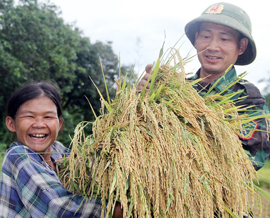 * Bộ đội Biên phòng giúp dân bản Rào Tre thu hoạch lúa.Ảnh: NGÂN GIANG