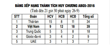 Cùng với một HCV có được ở môn bi sắt, tính đến hết ngày thi đấu hôm qua, đoàn Việt Nam đã có tổng cộng chín HCV, 12 HCB, 18 HCĐ, xếp thứ hai trên bảng xếp hạng thành tích huy chương. Vượt xa đoàn Việt Nam với 15 HCV, tám HCB, 11 HCĐ, đoàn Thái-lan hiện chiếm ngôi đầu. Xếp thứ ba sau Việt Nam là đoàn Trung Quốc với năm HCV, năm HCB, tám HCĐ.