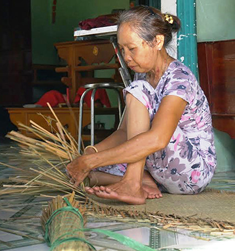 Một phụ nữ ngồi tỉ mỉ đương từng cọng bàng thành đệm.