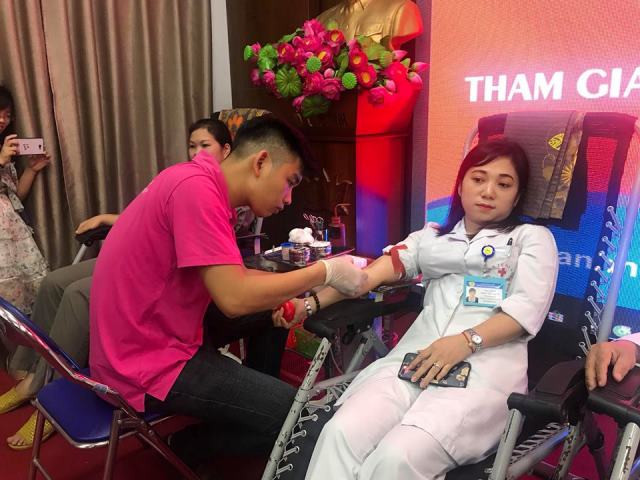 Rất đông cán bộ nhân viên y tế hiến máu.