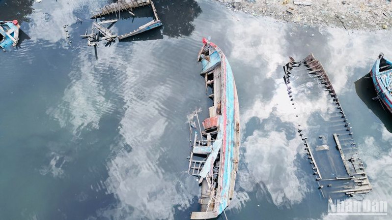 Từ cầu Thạnh Đức kéo dài hơn 500m đến khu vực cảng cá, nơi nhiều tàu cá cập bến bán hải sản, có khoảng 20 xác tàu nằm ngang, dọc từ vài năm qua. Một số tàu cá vẫn còn thân, dù không còn nguyên vẹn. Nhiều tàu đã bị sóng đánh vỡ hoặc mục ruỗng.