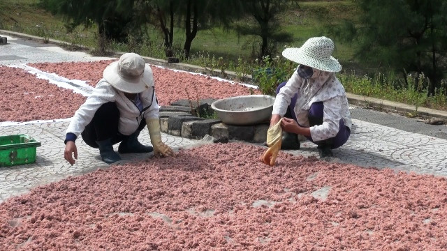 Người dân phơi ruốc khô để chế biến nguyên liệu.