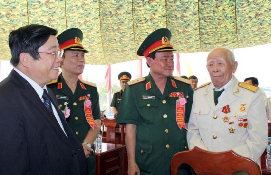 Lãnh đạo Quân khu 7 và tỉnh Lâm Đồng thăm cụ Tô Đình Cắm (bên phải), dịp kỷ niệm 69 năm Ngày thành lập Quân đội nhân dân Việt Nam.