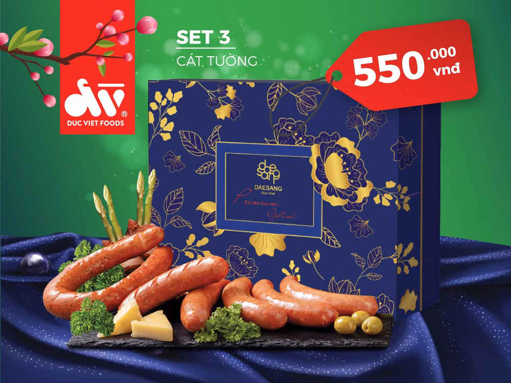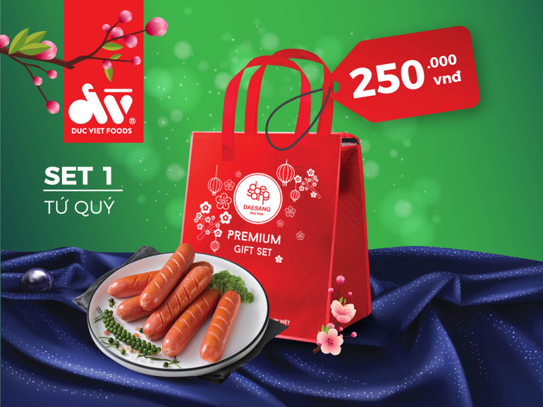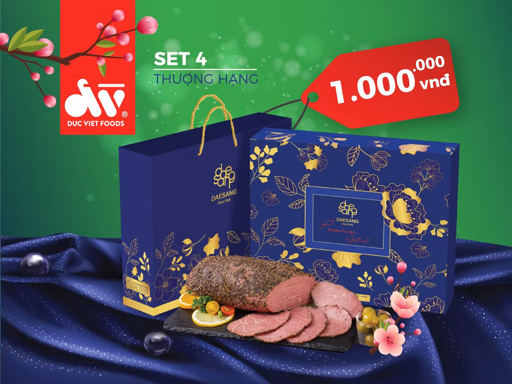 Với giá bán 1 triệu đồng, Set quà Tết thượng hạng của Đức Việt có tổng trọng lượng 2,65kg, bao gồm các dòng sản phẩm cao cấp: Xúc xích Kielbasa, xúc xích Becllin, chân giò ủ muối, bò tẩm tiêu nguyên khối, xúc xích nướng và dăm bông hấp.