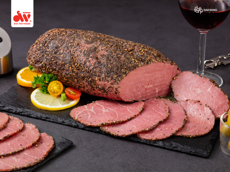 Bò tẩm tiêu nguyên khối hay còn gọi là Pastrami có trọng lượng khoảng 1kg. Đây là một món ăn thượng hạng với công thức nguyên bản từ châu Âu. Pastrami Đức Việt vừa có vị ngọt, thơm, giàu dinh dưỡng từ thịt bò cao cấp nhập khẩu, vừa có vị cay nồng từ tiêu đen, tạo nên món ăn đẳng cấp, được các khách sạn 5 sao, 6 sao vô cùng ưa chuộng.