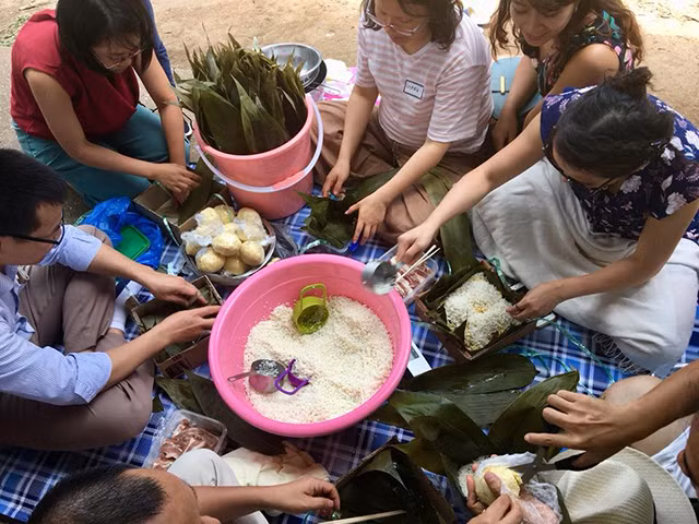 Ngày gói bánh chưng tại nhà chị Vũ Hoa Thắm đông như có hội. Nhiều bạn Lào không biết gói thì đến giúp các công việc khác như lau lá dong, đong đỗ, đong gạo và sắp xếp bánh chưng để nấu. Năm nay nhà chị Thắm gói được hơn 200 cái bánh chưng, phần để ăn ở nhà nhưng phần lớn làm quà Tết tặng các bạn Lào và Việt Nam.