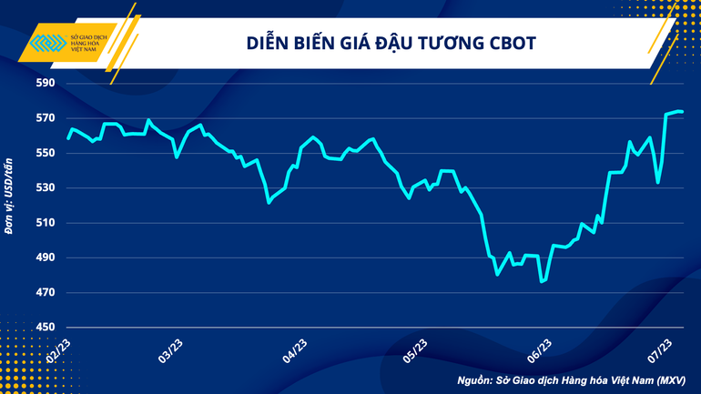 Số liệu từ Sở Giao dịch Hàng hóa Việt Nam (MXV) cho thấy, giá đậu tương hợp đồng tháng 11 (ZSEX23) niêm yết trên Sở Giao dịch Chicago (CBOT) đóng cửa phiên giao dịch ngày 30/6 ở mức 572,2 USD/tấn, tăng tới 6,12% so phiên trước đó, đồng thời là mức tăng hằng ngày lớn nhất mà hợp đồng này từng ghi nhận kể từ khi bắt đầu được giao dịch.