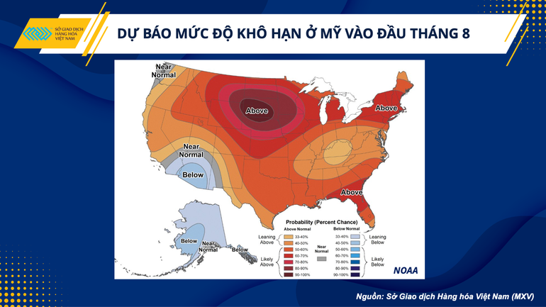 Tuy nhiên, khu vực được cung cấp độ ẩm lại nằm chủ yếu ở phía nam nước Mỹ. Trong khi đó, sản lượng ngô và đậu tương lại tập trung tới 90% ở khu vực phía trung tây. Ngoài ra, theo hình ảnh dự báo mới nhất của Cơ quan Quản lý khí quyển và đại dương Quốc gia Mỹ (NOAA) trong tuần đầu tiên của tháng 8, khô hạn nghiêm trọng hơn sẽ quay trở lại ở các khu vực gieo trồng chính và đe dọa đến giai đoạn phát triển của ngô và đậu tương.