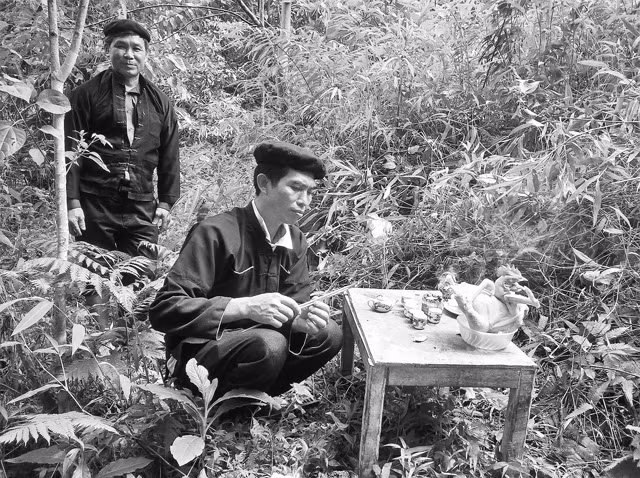 Sáu giờ sáng, sương còn giăng mù khắp nơi, chúng tôi cùng thầy cúng Pàn Pà Sẩu và một số người giúp việc leo ngược dốc, đi lên khe nước đầu nguồn. Ðến nơi, mọi người nhanh tay sắp lễ vật trên chiếc bàn nhỏ, gồm một con gà trống, một miếng thịt lợn, một chai rượu, một bát gạo để cắm hương và một bát nước. Bày xong đồ lễ, thầy cúng hát bài Mời thần. Tôi là người Dao Tiền nên nghe tiếng Dao Ðỏ có nhiều từ không hiểu nghĩa, song cũng đoán được đây là bài hát mời Ngọc Hoàng, Bàn Vương, thần đất, thần nước về phù hộ cho dân bản, cả năm mưa thuận gió hòa, đủ nước sinh hoạt, canh tác cho bà con trong bản. Bài hát có đoạn: Chắp tay lạy khấn Ngọc Hoàng/Lạy khấn Bàn Vương, tiên tổ/Thần thổ địa và Pù Rằn man/Xin về đây phù cho dân bản/Có được nguồn nước nhiều, nước trong.