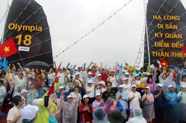 Mặc dù trời mưa rất to nhưng cũng không ngăn được niềm vui của thầy, cô giáo và các bạn học sinh trường THPT Hòn Gai cùng hơn năm nghìn người tại điểm cầu Hạ Long khi em Nguyễn Hoàng Cường giành được vòng nguyệt quế chinh phục đỉnh Olympia 2018.