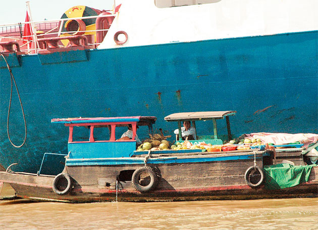 Muốn vào bờ “những thủy dân tạm trú” của ngã ba sông phải thuê đò ngang, mỗi chuyến ra vào chừng ba trăm ngàn. Khách ta có, thủy thủ tây cũng có. Lâu lâu, họ gom tiền hùn nhau đi vào bờ chơi một chuyến. Nào ăn hàng, đi hát karaoke, nhưng nhiều nhất là mua sắm vật dụng sinh hoạt cá nhân. Đi từ trưa, đến chiều thì lại ra sông. Có nhiều anh say khướt không leo nổi lên cầu thang bên hông tàu. Nhà tàu phải dùng máy cẩu đưa các anh này lên trên chiếc xuồng cứu hộ. Họ vẫy tay chào tất cả mọi người, chào thành phố, chào bầu trời đầy mây.