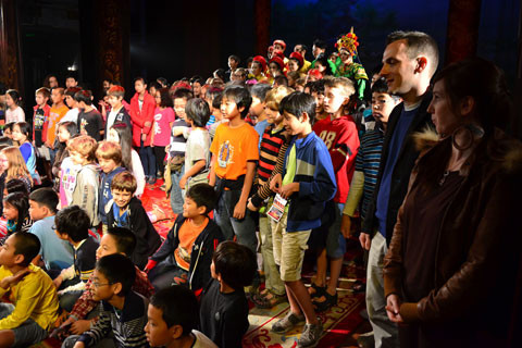 Khách du lịch tìm hiểu nhạc cụ sử dụng trong diễn tuồng.