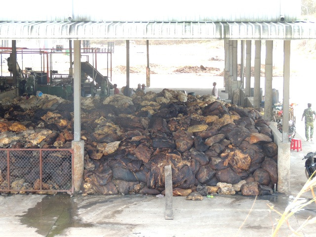 Tại kho tập kết, hàng trăm tấn mủ cao su vẫn được đưa vào sơ chế.