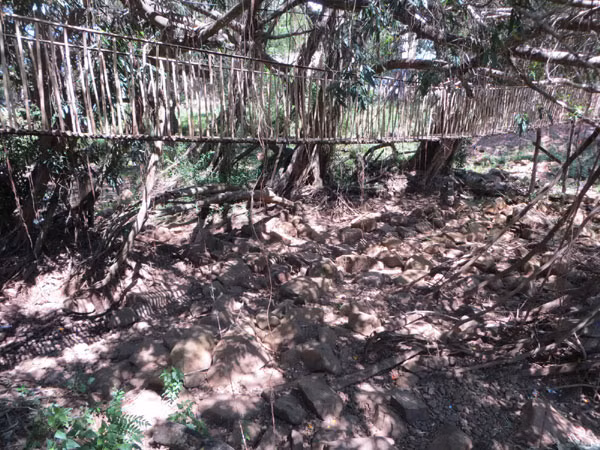 Sông Sê-rê-pốc khô cạn làm các cầu treo trở nên lạc lỏng, chơ vơ trên những rặng cây si già tàn úa.
