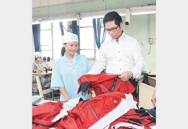 Ông Vũ Tiến Lộc tìm hiểu thực tế ở một doanh nghiệp may.
