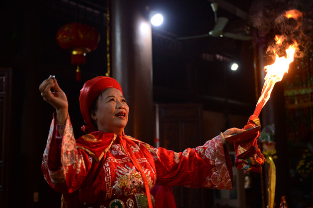 Nghệ nhân ưu tú Nguyễn Thị Nhỡ thực hành nghi lễ tại Phủ Phúc Sinh Trường (Thái Thụy, Thái Bình) - Tác giả ảnh: Nguyễn Á