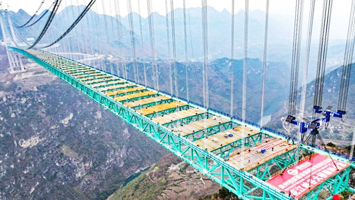 Cầu Huajiang Grand Canyon (trong ảnh) bắc qua sông Beipan, ở tỉnh Quý Châu (Trung Quốc), dự kiến trở thành cây cầu cao nhất thế giới sau khi hoàn thành vào nửa cuối năm 2025. Theo Xinhua, cầu Huajiang Grand Canyon chính thức được khởi công xây dựng vào tháng 1/2022 với tổng chiều dài 2.890 m, cao 625 m.