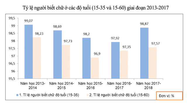 Theo Bộ Giáo dục và Đào tạo GD-ĐT, hiện nay tỷ lệ người biết chữ độ tuổi từ 15-60 là 97,65%. Với mục tiêu đề ra trong Đề án Xoá mù chữ, đến năm 2020 phải đạt 98% thì đến nay chúng ta cơ bản đạt được mục tiêu. Trong đó, số người biết chữ trong độ tuổi 15-35 chiếm tỉ lệ 98,92%; số người biết chữ trong độ tuổi từ 36-60 chiếm tỷ lệ 96,2%. Tỷ lệ người dân tộc thiểu số biết chữ độ tuổi 15-60 là 93,44%. Có 100% đơn vị cấp tỉnh, huyện và 99,9% đơn vị cấp xã duy trì đạt chuẩn xóa mù chữ.