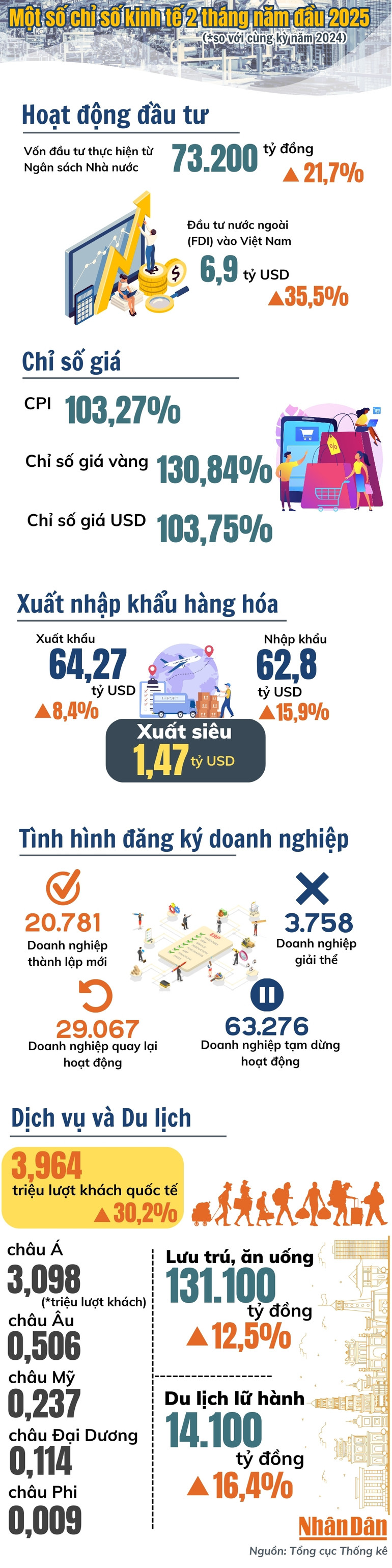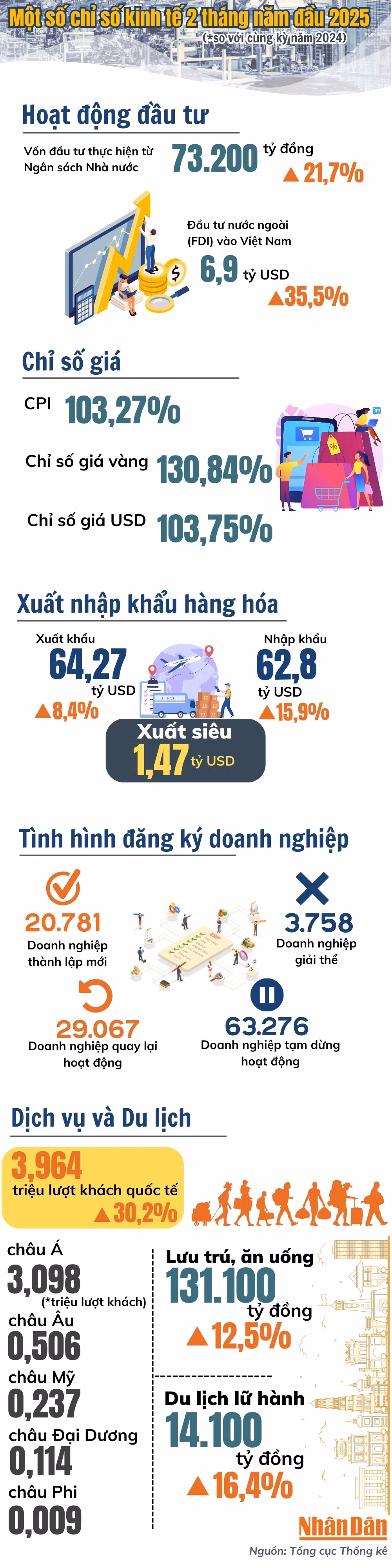 Theo số liệu của Tổng cục Thống kê, kinh tế 2 tháng đầu năm nay đón nhận khởi đầu tích cực để hướng tới mục tiêu tăng trưởng hơn 8% cho cả năm, trong đó ghi nhận tăng trưởng hơn 30% trong thu hút FDI (đạt 6,8 tỷ USD) và số lượng khách du lịch quốc tế (gần 4 triệu lượt khách).