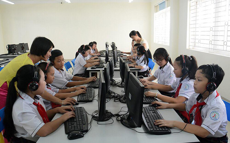 Giờ học tin học của học sinh trường tiểu học, khu đô thị Sài Đồng, Hà Nội.