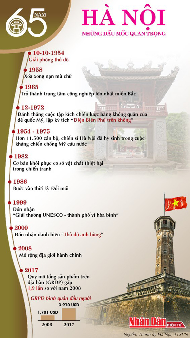 65 năm qua, đảng bộ, chính quyền và nhân dân Thủ đô Hà Nội luôn nhớ lời căn dặn của Chủ tịch Hồ Chí Minh: “Cả nước nhìn về Thủ đô ta. Thế giới trông vào Thủ đô ta, nên Thủ đô ta phải phấn đấu để trở thành một Thủ đô bình yên tươi đẹp, mạnh khỏe cả về vật chất và tinh thần”.