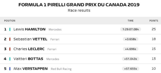 Thành tích của năm tay đua dẫn đầu sau chặng Canada GP sáng 10-6. (Ảnh: F1)