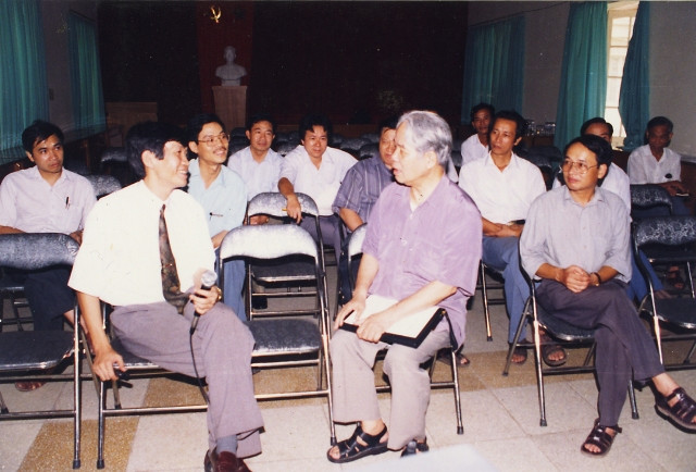 Đồng chí Đinh Thế Huynh, lúc đó là Phó Tổng Biên tập Báo Nhân Dân báo cáo đồng chí Đỗ Mười về Đề án xuất bản Báo Nhân Dân điện tử, tại Văn phòng T.Ư Đảng.