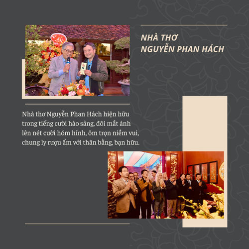 Mà tôi thấy, nhà thơ Nguyễn Phan Hách - ông hiện hữu trong tiếng cười hào sảng, đôi mắt ánh lên nét cười hóm hỉnh, ôm trọn niềm vui, chung ly rượu ấm với thân bằng, bạn hữu. Nên tôi càng tin, chính ông - có thể cả đất trời đã sắp đặt cuộc gặp gỡ kỳ duyên này - để những ai yêu mến ông được về tận vùng quê Kinh Bắc mà nghe câu ca quan họ, để thấm, để hiểu hơn về đất và người miền quan họ.