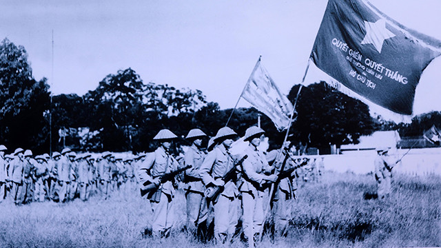 Một đơn vị Trung đoàn Thủ đô trong lễ chào cờ với lá cờ quyết chiến quyết thắng của Hồ Chủ tịch.