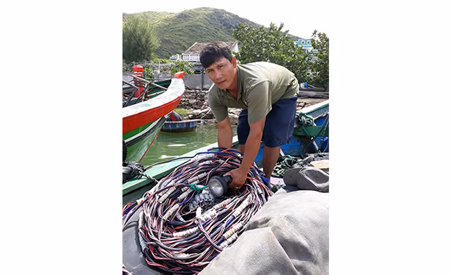 Ðể có bộ đồ lặn thì người dân phải đầu tư khoảng 11 triệu đồng, gồm một bộ đồ nhái, bình hơi, dây, đèn, cuộn chì và một vài dụng cụ khác. Tôi hỏi, vì sao biết nhọc nhằn mà vẫn phải làm. Anh Huynh lý giải: “Do không có điều kiện đầu tư phương tiện đánh bắt đắt tiền”.