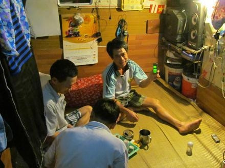 Cái lán bằng gỗ vụn vặt, chắp vá lại thành hai tầng dựng trên nền đất rộng hơn 100 mét vuông, tầng trên chia thành những phòng nhỏ, tầng dưới để để xe và chứa đồng nát sắt vụn. Mỗi phòng từ 2-5 người ở, rộng khoảng chừng 5 mét vuông và có giá thuê 500 nghìn đồng/tháng. Cô Vũ Thu Hường (33 tuổi) đon đả mời chúng tôi vào thăm căn phòng của hai vợ chồng. Góc sinh hoạt là chiếc phản đủ rộng để chải tấm chiếu cói, hai cái gối có vỏ bọc bằng vải thun và chiếc chăn sờn cũ. Nồi niêu, bát đĩa được xếp gọn vào một góc. Chếch lên một chút là cái mắc treo vài bộ quần áo.
