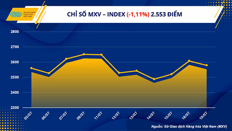Chỉ số MXV-Index của cả 4 nhóm nguyên liệu đều kết phiên trong sắc đỏ, dẫn đầu là nhóm kim loại khi thị trường đồng và quặng sắt vẫn đang chịu áp lực về suy thoái bất động sản. Tuy nhiên, dòng tiền phân bổ vào nhóm này đã tăng mạnh khi các nhà đầu tư đón bắt xu hướng giảm của giá nhằm tìm kiếm lợi nhuận. Mặt khác, thị trường nông sản đứng trước triển vọng về mùa vụ đã tạo áp lực lên giá của 6 trong tổng số 7 mặt hàng trong nhóm. Giá trị giao dịch toàn Sở đạt mức hơn 3.000 tỷ đồng.
