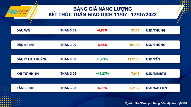 Giá dầu thô thế giới giảm tuần thứ hai liên tiếp với hợp đồng dầu thô WTI tháng 8 giảm 6,87% về 97,59 USD/thùng, hợp đồng dầu thô Brent tháng 9 giảm 5,48% về 101,16 USD/thùng. Sức ép bán áp đảo trên thị trường trước một loạt các tin tức vĩ mô tiêu cực và các báo cáo quan trọng của nhiều tổ chức lớn.