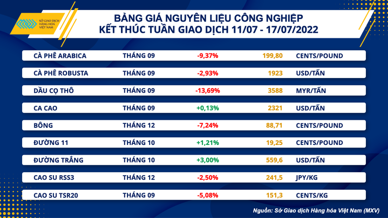 Hai mặt hàng cà-phê cũng chung xu hướng giảm, trong đó, Arabica giảm hơn 9% và Robusta giảm gần 3%. Tiến độ thu hoạch được cải thiện tại các vùng trồng cà-phê chính của Brazil đã giúp hạn chế phần nào lo ngại về thiếu hụt nguồn cung cà-phê trong ngắn hạn, khi tồn kho đạt chuẩn của Arabica trên sàn ICE US liên tục giảm về mức thấp nhất trong vòng 23 năm trở lại đây.