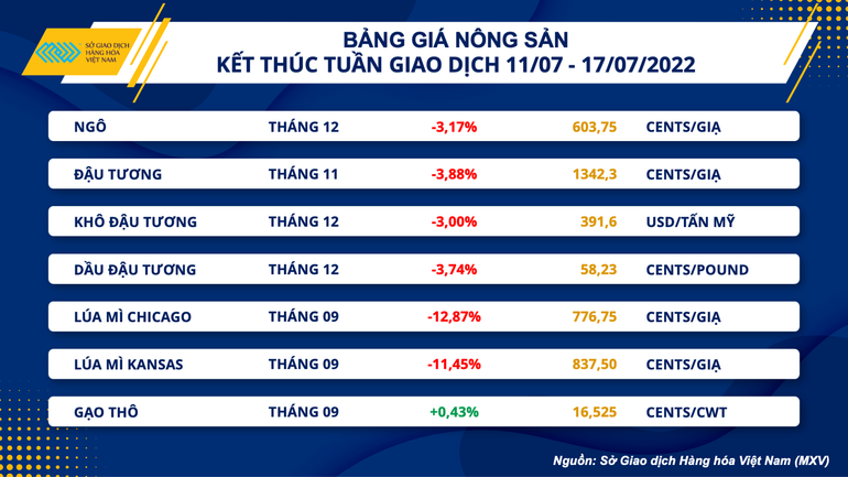 Cùng diễn biến với ngô, giá lúa mì hợp đồng tháng 9 cũng đóng tuần giao dịch vừa qua trong sắc đỏ. Đây cũng là tuần giảm mạnh nhất của mặt hàng này trong vòng hơn 10 năm trở lại đây. Kỳ vọng của thị trường về nguồn cung từ các nước xuất khẩu lớn trên thế giới là yếu tố gây áp lực lên giá mặt hàng này.