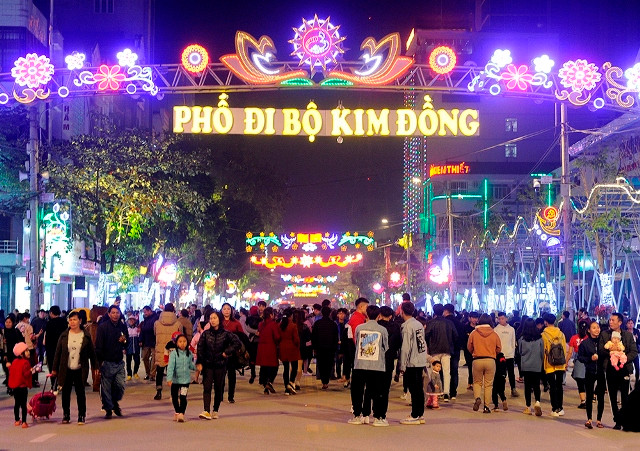 Không gian phố đi bộ Kim Đồng (thành phố Cao Bằng, tỉnh Cao Bằng) nhộn nhịp dịp cuối tuần.