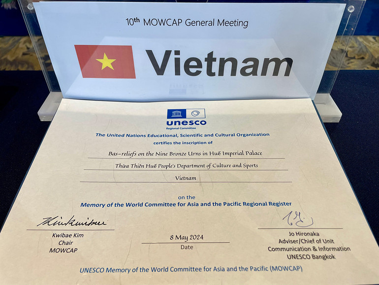 Việc "Những bản đúc nổi trên chín đỉnh đồng ở Hoàng cung Huế" được ghi danh Di sản tư liệu khu vực châu Á - Thái Bình Dương, đã nâng tổng số di sản tư liệu của Việt Nam được UNESCO ghi danh lên 10 di sản (gồm 3 di sản tư liệu thế giới và 7 di sản tư liệu khu vực châu Á - Thái Bình Dương).
