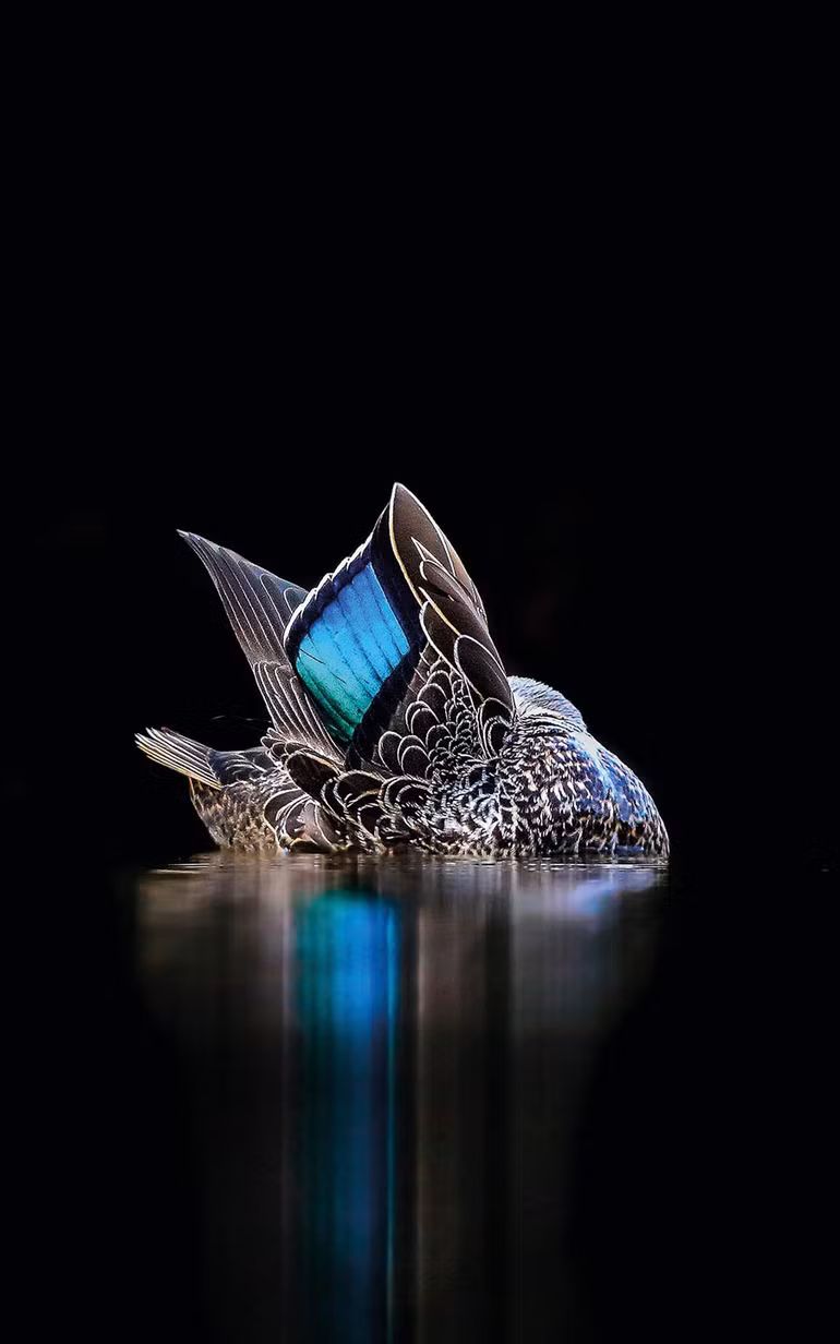 Một con vịt đen Thái Bình Dương (Anas superciliosa) cho thấy lông đặc trưng của nó ở Garvey Park, Perth, Tây Úc. “Tôi chụp bức ảnh này tại một cái hồ nhỏ. Vùng nước tĩnh lặng và màu đen trong nền là một cơ hội để làm nổi bật những chiếc lông tuyệt đẹp. Tôi chỉ phóng đại hiệu ứng trong Adobe Lightroom (và cắt xén), ngoài ra không hề thay đổi ảnh ban đầu”.