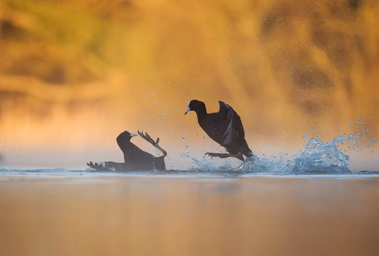 Hai con chim cút (Fulica atra) "chiến đấu" trong một cuộc tranh chấp về lãnh thổ, trên nền hồ được chiếu sáng bởi ánh sáng mặt trời buổi bình minh.