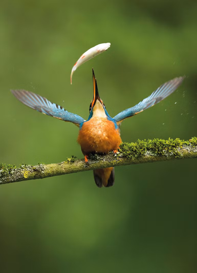 Bói cá sông (Alcedo atthis) ở Suffolk, Anh. "Con chim này bắt cá này bằng cách đánh bằng mỏ của nó. Nó bay đến một nhánh gần đó, hất đầu nó xuống rồi ném cá lên không trung, sau đó bắt nó lại.”