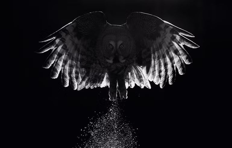 Một tuyển tập các hình ảnh đen trắng của loài cú xám lớn (Strix nebulosa) vào lúc hoàng hôn ở phía đông bắc Phần Lan.