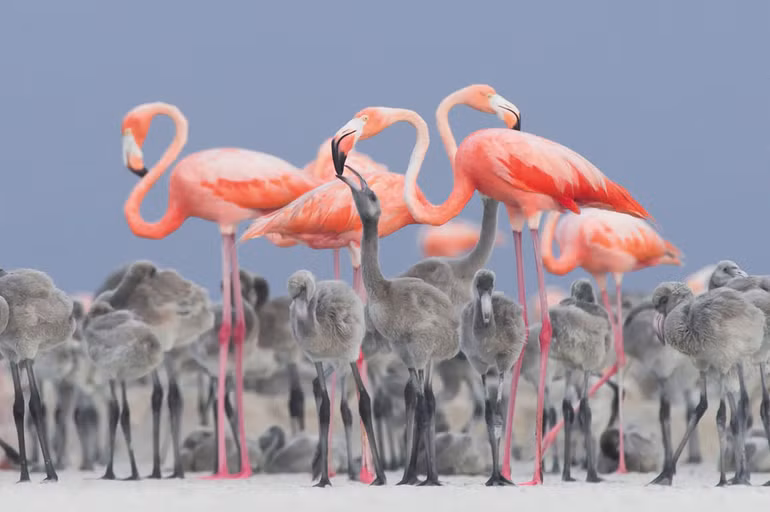 Hình ảnh này được chụp trong lúc chim hồng hạc mớm cho con ăn (Phoenicopterus ruber) ở khu vực làm tổ tại Río Lagartos ở Mexico.