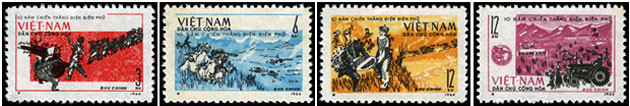 * “Kỷ niệm 10 năm chiến thắng Điện Biên Phủ” gồm bốn mẫu và một blốc tem, phát hành ngày 7-5-1964;