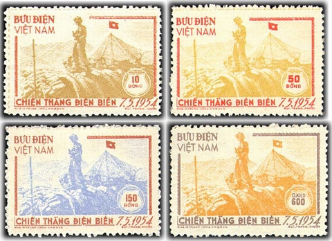 * “Chiến thắng Điện Biên Phủ” gồm bốn mẫu tem, phát hành ngay tháng 10-1954;