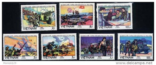 * “Kỷ niệm 30 năm chiến thắng Điện Biên Phủ”, bảy mẫu tem và một blốc tem, phát hành ngày 7-5-1984;