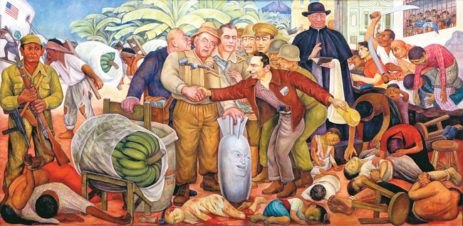 Bức tranh tường khổ lớn “chiến thắng vinh quang” của danh họa Diego Riveria mô tả cuộc đảo chính quân sự do CIA tổ chức nhằm lật đổ chính phủ dân chủ cánh tả mới được bầu của Cộng hòa Guatemala. Ở giữa tranh là Ngoại trưởng Mỹ John Foster Dulles đang bắt tay với người cầm đầu cuộc đảo chính, Đại tá Castillo Armas. Tay kia của ông Dulles đang đặt trên quả bom có in mặt của tổng thống Mỹ Dwight D. Eisenhower - người quyết định cho tiến hành đảo chính. Phần nền tranh có vẽ rất nhiều cây chuối và những buồng chuối đang được những công nhân còng lưng chuyển lên tàu hàng của Công ty hoa quả Mỹ (United Fruit Company). Allen Dulles là người mặc áo xanh tím than, đứng sau lưng anh trai ông là John Foster Dulles, đang chia tiền cho binh lính. Allen Dulles là Giám đốc CIA và đồng thời là thành viên ban giám đốc điều hành của Công ty hoa quả Mỹ. Chuối ở Guatemala trở thành một thứ hàng hóa thiết yếu đến nỗi thuật ngữ “Cộng hòa quả chuối” (Banana Republic) ra đời nhằm chỉ những đất nước Mỹ La-tinh có nền kinh tế sản xuất yếu kém, phụ thuộc chính trị vào Mỹ và xã hội phân hóa bất công.