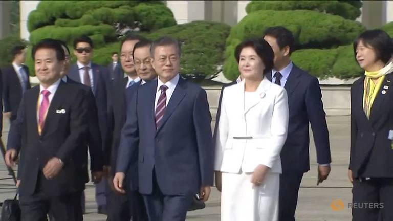 Tổng thống Hàn Quốc Moon Jae-in và Phu nhân Kim Jung-sook trước khi rời căn cứ không quân Seoul để tới Bình Nhưỡng tiến hành hội nghị thượng đỉnh lần thứ ba với nhà lãnh đạo Triều Tiên Kim Jong-un. (Ảnh: KBS/ REUTERS TV)