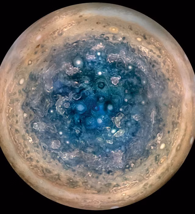 Bức ảnh cực nam sao Mộc chụp trực diện từ độ cao 51.500 km so với bề mặt hành tinh. Có thể thấy rõ các cơn lốc xoáy tạo thành những dải xanh nhạt với bề rộng của mỗi dải lên tới 965km. Để tiện so sánh, bang Texas của nước Mỹ cũng chỉ có bề rộng đạt 1.270km.