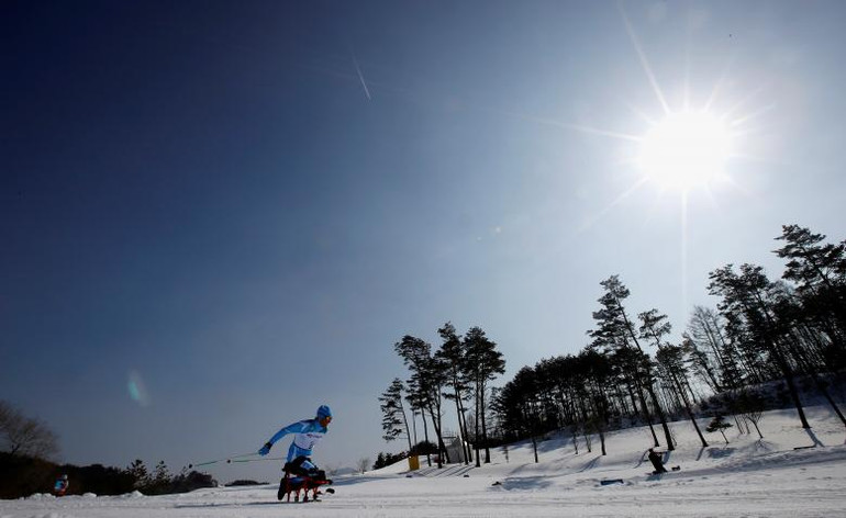 VĐV Christoph Kunz của Thuỵ Sĩ cạnh tranh trong phần thi trượt ngồi nam. (Ảnh: REUTERS / Paul Hanna)