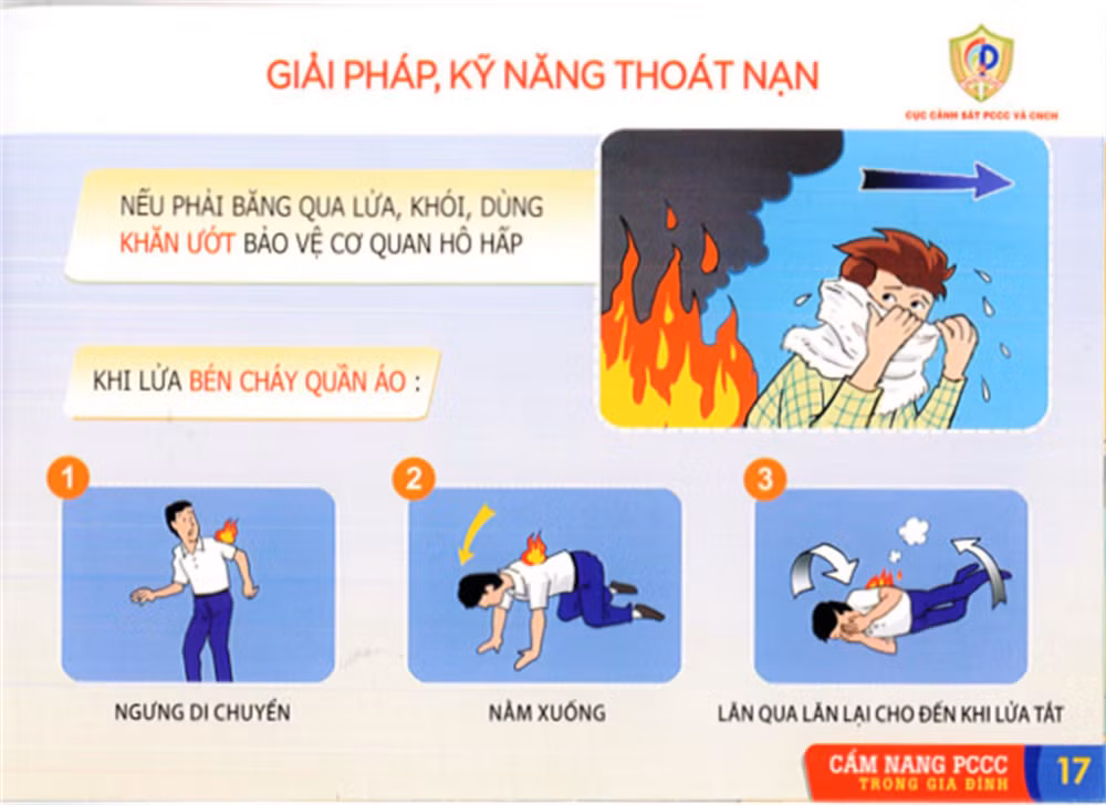 Trong quá trình di chuyển cần bình tĩnh và thực hiện các biện pháp để tránh hít phải khói, khí độc bằng cách lấy khăn, áo thấm ướt bịt vào mũi, miệng.